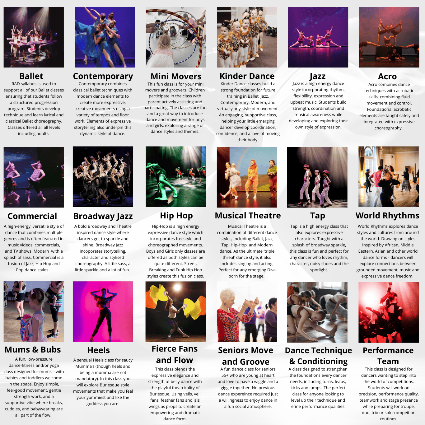 Free trial class for new students, multi class discounts and casual class options for adult classes and mini movers available.