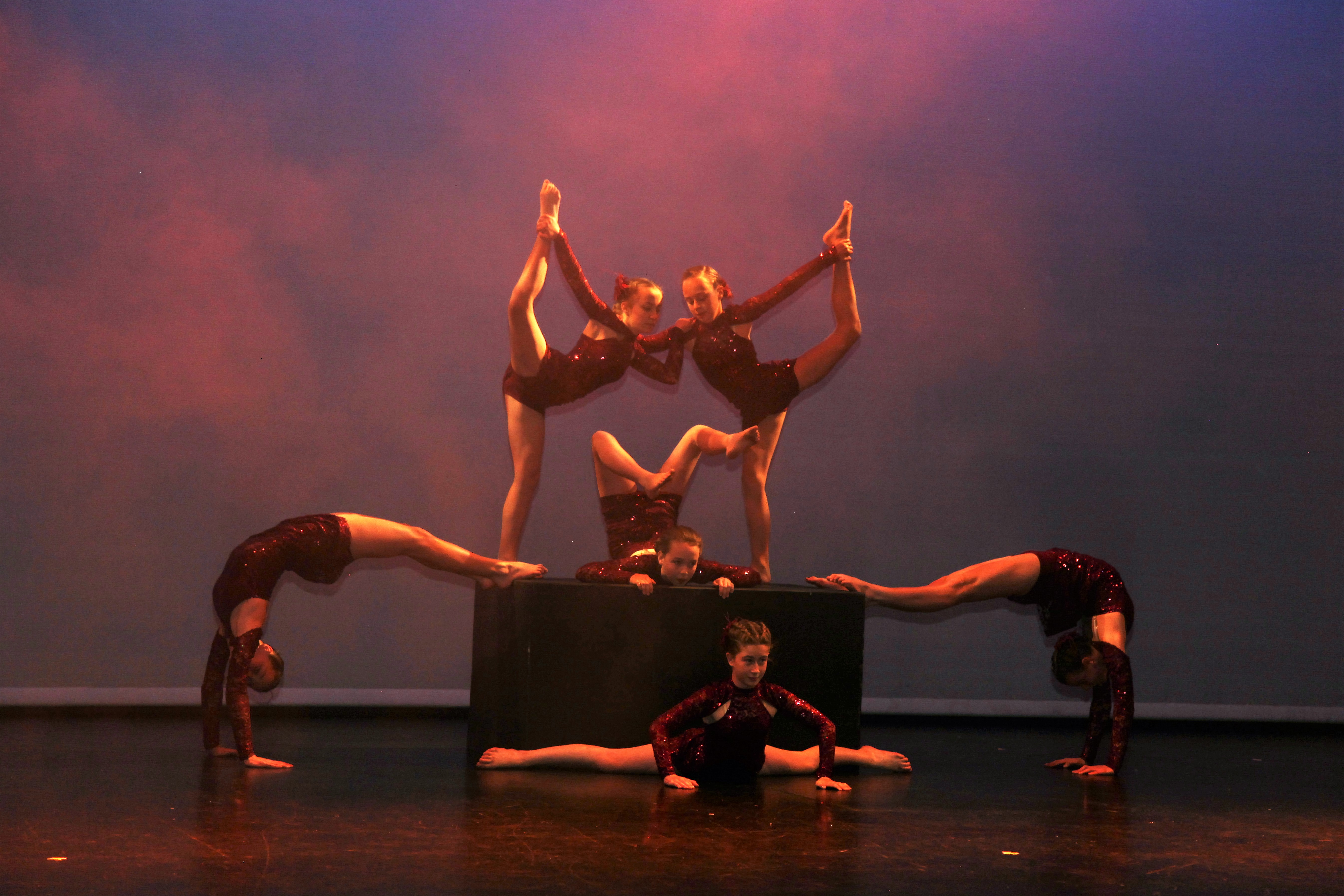 Acro combines dance techniques with acrobatic skills, combining fluid movement and control. Foundational acrobatic elements are taught safely and integrated with expressive choreography.